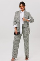 Жакет полуприлегающего силуэта с естественной линией плеча. Спинка со средним швом и рельефами из плеча. Перед с рельефами из плеча. Застежка центрально-бортовая на петлю-пуговицу. Воротник отложной пиджачного типа.