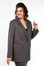 Жакет свободного покроя с естественной линией плеча на подкладке. Спинка со средним швом. Перед с нагрудными вытачками и настроечными листочками. По переду обработана отрезная планка плавно переходящая в борт и горловину. Вырез горловина V-образной формы. Борта жакета закруглённые. Застежка центрально-бортовая на петли-пуговицы. Рукав двухшовный длинный с отрезной манжетой и настроченной планкой.