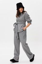 Жакет свободного покроя с естественной линией плеча на подкладке. Спинка со средним швом. Перед с нагрудными вытачками и настроченными листочками. По переду обработана отрезная планка плавно переходящая в борт и горловину. Вырез горловины V-образной формы. Борта жакета закруглённые.Застежка центрально-бортовая на петли-пуговицы. Рукав двухшовный длинный с отрезной манжетой и настроченной планкой.