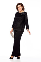 Блуза свободного прямого силуэта, с округлой формой горловины, линия плеча спущенная с отложной манжетой по низу фиксируется декоративной пуговицей в качестве отделки. Спинка в блузе с отрезной кокеткой из отделочной ткани ришелье, на просвет, декоративной застёжкой на петли пуговицы. Низ в блузе ассиметричный с разрезами в боковых швах и пришивным декоративным элементом по низу переда. Блуза без подкладки. Юбка длинная, с притачным поясом со вставкой из эластичной тесьмы-резинки от талиевых вытачек по переду и спинке юбки. По переду юбки функциональная планка с застёжкой на петли и пуговицы. Юбка с притачной кокеткой с талиевыми вытачками и заложенными складками от подреза. По низу юбки притачной волан со сборкой от подреза. Юбка на подкладке. Обращаем Ваше внимание, что фурнитура может незначительно отличаться от фото. Длина блузки по центру спинки 59 см (р.52-56), 59,5 см (р.58-62). Длина рукава(плеча) 26,5 см (р.52-56), 29,5 (р.58-62). Длина Юбки 90 см.