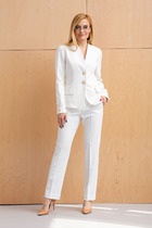 Невероятно яркий двух- предметный костюм для Вашего неповторимого образа выполнен из приятной на ощупь ткани помогая создать стильный образ, который будет уместен как для торжественных случаев, так и для деловых встреч. Жакет полуприлегающего силуэта на подкладке, с двубортной застёжкой на петли пуговицы по краю борта. Воротник пиджачного типа с лацканами. По переду жакета рельефы со вставками декоративной бахромы из основной ткани. Спинка с средним швом и декоративными рельефами. Рукав втачной, длинный, двухшовный. Юбка прямого силуэта длины «миди» с планкой, с имитацией застёжки на пуговицы по переду, переходящей в шлицу. Пояс в юбке притачной с вставкой эластичной тесьмы-резинки в бочка. По переду юбки наклонные карманы. По спинке в среднем шве застёжка на потайную тесьму-молнию и талиевые вытачки. Юбка на подкладке.Обращаем Ваше внимание, что фурнитура может незначительно отличаться от фотографии. Длина жакета от высшей плечевой точки до низа 63.5 см (р.50-54), 64 см (р.56-60), длина рукава 62 см. Длина юбки по среднему срезу заднего полотнища с поясом 81 см.
