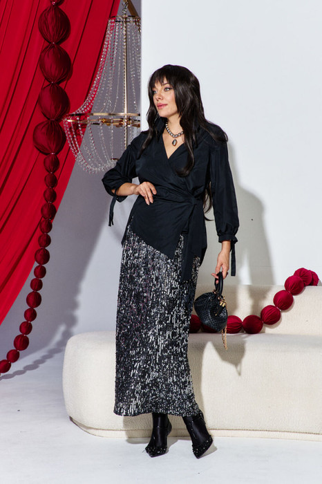 Потрясающий юбочный комплект, состоящий из блузки и юбки, который подарит вам ощущение праздника и непринуждённости. Ассиметричный крой блузы отлично гармонирует с ярким в пайетки низом, создавая тем самым идеальный комплект. Блуза прямого силуэта с запахом на поясе завязке с декоративным элементом в виде вышивки на какетке спинки. Горловина V-образная, воротник рубашечный с дизайнерским решением. С фигурными рельефами по переду и ассиметричным низом. Спинка блузки с рельефом и с запахом внизу. Рукав втачной одношовный по низу со сборкой и манжетом с завязкой. Юбка прямого силуэта. Пояс цельновыкроенный с эластичной тесьмой, что обеспечивает максимально комфортную посадку на любой тип фигуры. Юбка на трикотажной подкладке, по низу со внутренней стороны обтачка из подкладочной ткани для максимального удобства. Длина блузы по спинке 71 см. Длина рукава 50 см. Длина юбки 96 см.