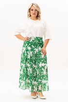 Костюм женский, состоящий из блузки и юбки длины «миди». Костюм представляет собой манифест в ткани — соединение традиционной техники ришелье с современным мятым эффектом, создающее образ смелой, творческой женщины, не боящейся ярких цветовых решений и сложных текстурных сочетаний. Этот костюм — не для того, чтобы слиться с толпой. Он для того, чтобы выделиться, но не криком, а умной, продуманной эстетикой. Блузка свободного силуэта  с ассиметричной линией борта, застёжкой на потайные декоративные кнопки. Вырез горловины V-образной  формы с притачным отложным ассиметричным воротником из отделочной однотонной ткани с «мятым эффектом». Рукав в блузке цельнокроеный с отложной манжетой из отделочной однотонной ткани с «мятым эффектом».  Спинка в блузке без особенностей. Низ ассиметричный, в боковых швах разрезы. Юбка трапециевидного силуэта, длины «миди». Пояс в юбке притачной с вставкой декоративной тесьмы-резинки, которая обеспечивает максимально удобную посадку на любой тип фигуры. Юбка с притачным воланом со сборкой от подреза. В боковых швах юбки карманы. Юбка на подкладке. Эффект "мятости" это не случайность — это продуманная небрежность, она добавляет тактильного интереса к визуальному образу. Каждая юбка уникальна — узор складок никогда не повторяется. Длина блузки 57 см (р 52-56), 57,5 см (р 58-62). Длина укава 31 см (р 52-56), 34 см (р 58-62). Длина юбки 86 см.