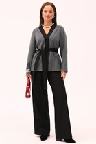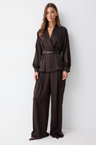 Костюм женский из трикотажного полотна в комбинации двух видов: полотна "кулирка-кармеланж" и полотна "кулирка" с набивным тематическим рисунком, состоящий из футболки и брюк. Футболка - модного силуэта, слегка укороченная свободного покроя, с приспущенным плечом, с втачными рукавами длиной до локтя, горловиной овальной формы, обработанной втачной планкой и принтом в центре переда. По шву втачивания планки настрочена декоративная (5-ниточная) отделочная строчка нитками контрастного цвета Подгибка низа рукавов и изделия так же выполнена с применением декоративной отделочной строчки. Брюки выполнены из полотна с набивным тематическим рисунком, длинные, умеренной ширины, прямые, с эластичной тесьмой по талии.