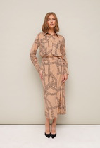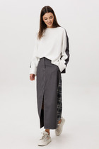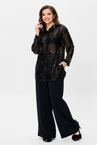 Костюм женский из трикотажного полотна "кулирка" в комбинации двух видов: гладкокрашенного и с рисунком в крупную клетку, сочетающихся между собой по цвету, состоящий из джемпера и брюк. Джемпер - из гладкокрашеного полотна, свободного покроя, с длинными втачными рукавами и приспущенными плечами, с горловиной овальной формы и тематическим принтом, выполненным в технике шелкографии. Горловина, нижние срезы рукавов и низ изделия обработаны подгибкой с отделочным широким кантом контрастного цвета. Брюки - из полотна в клетку, свободного покроя, прямые, на притачном поясе с эластичной тесьмой внутри, с карманами в боковых швах. Нижние срезы обработаны подгибкой.