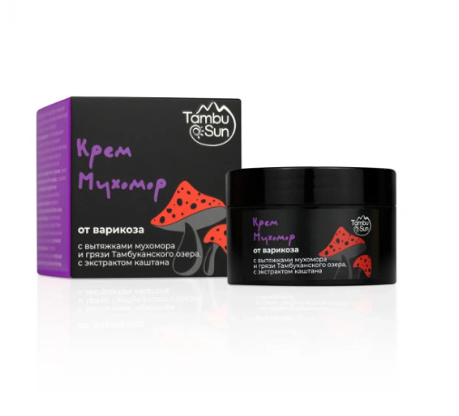 Мухомор в сочетании с вытяжкой целебной тамбуканской грязи ценится за свои способности улучшать микроциркуляцию крови, а такое вещество, как лентинан в составе гриба эффективно предотвращает процесс преждевременного разрушения кожных кровеносных микрокапилляров, благодаря чему крем незаменим в устранении варикозного расширения вен.