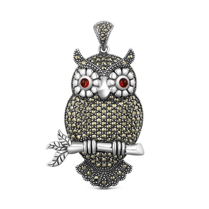 Кулон из чернёного серебра с натуральным гранатом и марказитами - Сова 925 пробы