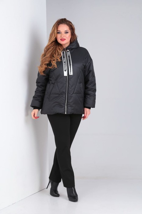 Куртка женская свободного облегания с застёжкой на молнию.Спина с фигурной стёжкой.Перед также с фигурной стёжкой и боковыми прорезными карманами.Воротник-капюшон с центральной и боковыми частями с кулисой и шнуром и блочками.Рукав одношовный  со спущенной линией плеча с фигурной стёжкой  и притачными изнутри  манжетами - довязами. Куртка на подкладке с декором - печатью на спинке и кулисой со шнуром по низу.Куртка утеплённая .По спинке декор-нашивка.