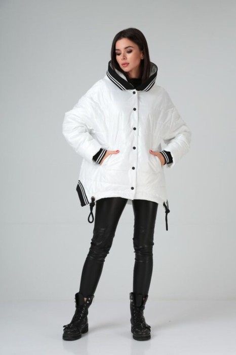 Куртка женская свободного кроя представлена в большом размерном ряде. Современная и удобная куртка  освежит гардероб, а благодаря непромокаемой и непродуваемой ткани зищитит от непогоды. Утеплитель " Hoopon" подходит для температуры от 0 до - 5. Объемный капюшон украшен трикотажным довязом. Перед с удобными боковыми карманами. Рукава со спущенной линией плеча, а внизу с трикотажными манжетами . По бокам внизу фигурные разрезы округлой формы  так же украшены трикотажными довязами и шнуром. Застежка на кнопках выглядит современно и очень удобна в эксплуатации.