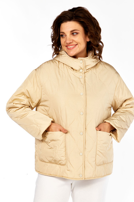 Куртка женская с центральной бортовой застежкой на кнопки. Спинка простая. Перед с боковыми накладными карманами. Рукав втачной одношовный с широкой подгибкой. Воротник-капюшон с центральной и боковыми частями и застежкой на 2 кнопки. Куртка на подкладке.