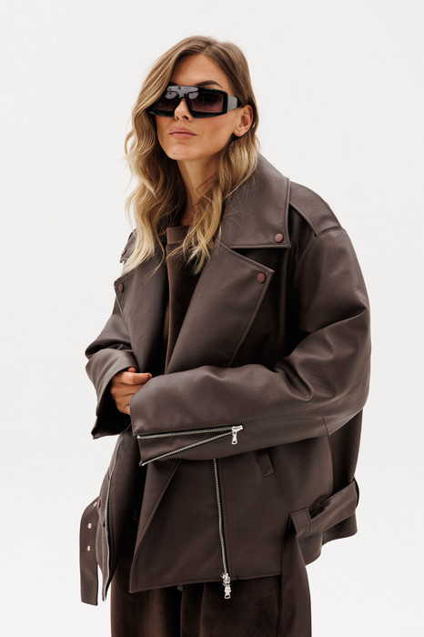 Куртка выпонена из эко-кожи. Куртка прямого силуэта, покроя "oversize". Спереди прорезные карманы, лацканы, один клапан справа, и смещенная застежка на молнию. На спинке фигурные подрезы от плечевого шва до боковых. Вортник пиджачного типа. Плечевой шов удлинен. Рукав рубашечного покроя, двухшовный. В заднем шве рукава молния с металлическими звеньями. В окаты вставлены погоны, по низу куртки протянут пояс из основной ткани с металлической пряжкой. На концах воротника, лацконов, по погонам и клапану  пробивные кнопки. Куртка на утепленной притачной по низу подкладке.