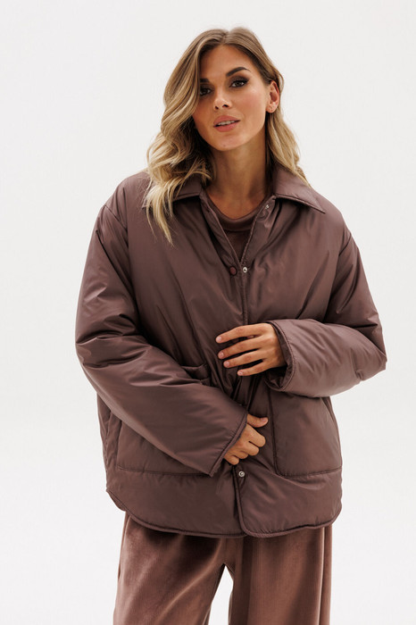 Куртка выполнена из плащевой ткани с утеплителем Isosoft. Куртка прямого силуэта, длиной до линии бедер. Спереди прорезные карманы и центральная бортовая застежка на кнопки. Спинка цельная. Воротник стояче-отложной. Плечевой шов удлинен. Рукав рубашечного покроя , одношовный. Низ куртки фигурной формы. Спинка чуть длинее. Куртка на притачной по низу подкладке.