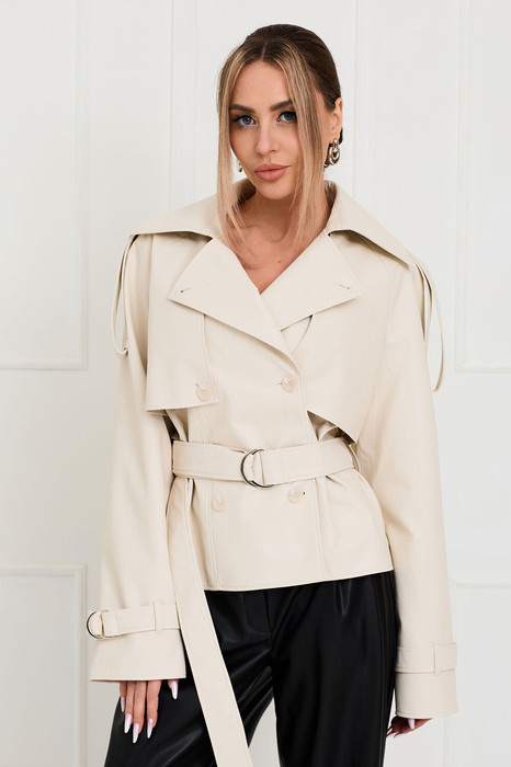 Куртка с центральной двубортной застежкой на петли и пуговицы, втачным воротником с отрезной стойкой. По переду с отлетными кокетками, рельефами, выходящими из плеча. Спинка со средним швом, отлетной кокеткой, средним швом. Рукав длинный, реглан. По плечевым швам и низу рукава- паты со шлевками. Куртка со сьемным поясом.