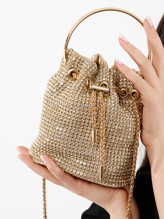 Сумка женская выполнена из текстиля, декорирована стразами, с элементами эко кожи. Детали: 1 короткая ручка 25см, 1 длинный ремешок на плечо из цепочки 120см. Внутри изделия: 1 отделение, застежка на фастекс – замок, 1 открытый карман. Брендированная подкладка из хлопка. Металлическая брендированная фурнитура золотистого цвета. В комплекте фирменный пыльник.