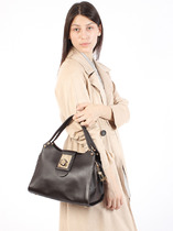 Сумка женская выполнена из натуральной кожи. Детали: хлястик на поворотном замке, 2 короткие ручки по 35см. Внутри изделия: 1 отделение на молнии, 1 карман на молнии, 1 открытый карман. С наружи изделия: 1 карман на молнии с оборотной стороны изделия и 1 карман спереди. Металлическая брендированная фурнитура серебристого цвета. В комплекте фирменный пыльник.