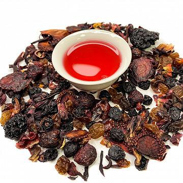 Гибискус, смородина, малина, ежевика, клюква, листья земляники, изюм, шиповник, клубника. Ароматизирован натуральными маслами.