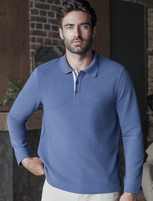Состав: 80%Хлопок 20%ПЭСтильный лонгслив синего цвета с эффектом меланж с плетеным воротником поло с застежкой на металлические пуговицы выполнен из премиального хлопка в сочетании с эластаном . Невероятно мягкая ткань из натуральных волокон - она едва ощутима на коже и словно обнимает тело. Материал при касании кажется бархатистым, при движении он словно повторяет все мельчайшие линии фигуры. По свойствам материал сочетает в себе практичность и нежность: отлично провускает воздух, сохраняя ощущение свежести в течение всего дня, при этом созраняет тепло в прохладную погоду.Идеально подходит для чувствительной кожи, не вызывает раздражения и дискомфорта. Удобный отложной воротник с контрастной отделкой делает образ современным и стильным, а длинные рукава с манжетами защищают руки при ветреной погоде.