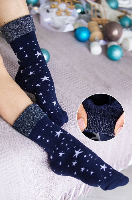 Махровые носки с рисунком Звезды выполнены из мягкой пряжи с высоким содержанием хлопка. Теплые носки с высоким бортом идеальны для уютных домашних вечеров.