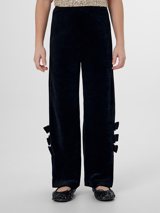 Брюки для девочек, с высокой посадкой, прямого силуэта. Пояс цельнокроеный с эластичной тесьмой внутри 30RV. Боковые швы с разрезами. Внизу, на боковом шве штанины расположено три бантика. Низ в подгибку