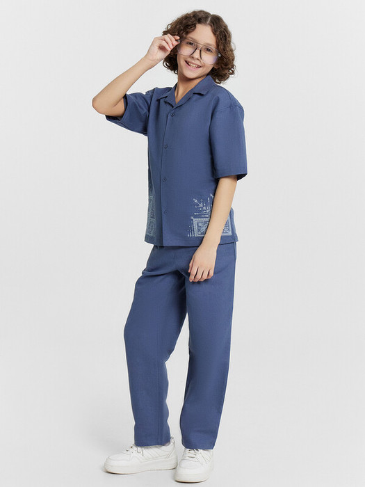 Брюки для мальчиков из ткани. Брюки длинные с классической линией талии. Силуэт прямой, брюки заужены немного к низу. Пояс цельнокроеный. Верхний срез брюк