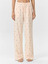 Брюки прямые свободные. Посадка средняя. Пояс цельнокроеный с эластичной тесьмой внутри. С внешней стороны пояса пробиты петли и втянут шнур. В боковых швах обработаны карманы. Подкладка карман из основного полотна. Нижние срезы обработаны швом вподгибку.