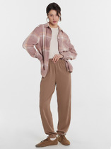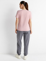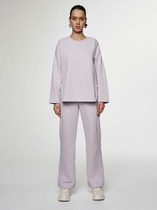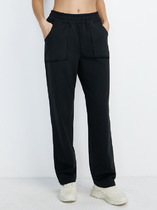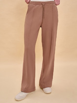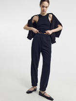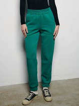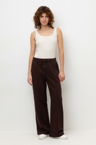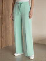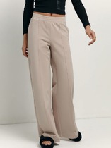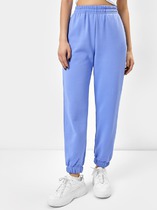 Брюки изготовлены из трикотажного полотна футер. Брюки прямые с высокой посадкой. Пояс отрезной из рибаны с эластичной тесьмой внутри. В передней части пояса с лицевой стороны пробиты петли и втянут шнур. Шов втачивания пояса распошит. Спереди обработаны карманы хулиганы. По низу брюк отрезные манжеты из рибаны.