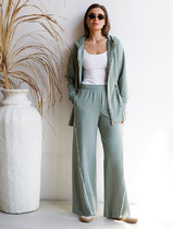 Брюки свободного силуэта. Пояс цельнокроеный, с втаченной эластичной тесьмой, отстрочен. Карманы в боковом шве. Низ брюк обработан в подгибку с эластичной тесьмой.