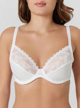 Чашки отрезные с нагрудной вытачкой и с длинным ухом, переходящим в бретель. По срезу втачивания чашек между слоями полотна стоит эластичная тесьма..