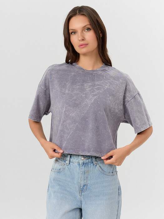Укороченная хлопковая футболка из полотна кулирка. Силуэт свободный, оверсайз. Горловина круглой формы. Плечо спущено, пройма углублена – это делает движения максимально комфортными. Рукава длиной до локтя или чуть выше. Стильная модель!