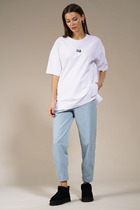 Хлопковая футболка свободного силуэта из трикотажного полотна кулирка. Горловина круглой формы. Свободу движений гарантируют спущенная линия плеча и углубленная пройма. Рукава широкие, чуть выше локтя. Стильная модель!