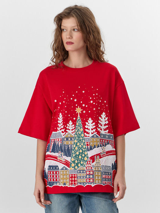 Футболка с новогодним принтом — идеальный выбор для создания праздничного настроения. Свободный оверсайз крой и спущенная линия плеча позволяют футболке мягко скользить по фигуре, не обтягивая ее, что дарит полную свободу движений. Короткие рукава и круглая горловина с отделкой из рибаны сохраняют мягкое, ненавязчивое касание к коже, обеспечивая удобство без давления.