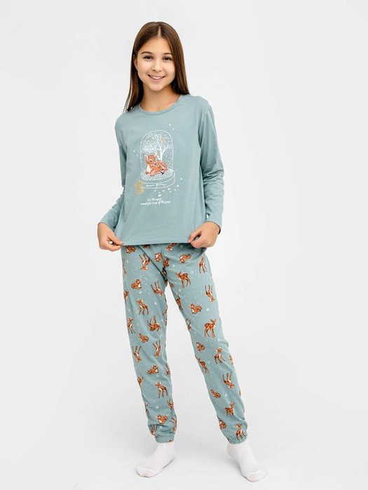 Горловина круглой формы с притачной обтачкой из основного полотна. Рукава длинные втачные. Перед и спинка цельнокроеные. Низ джемпера и рукавов обработан швом в подгибку. Брюки длинные, немного заужены к низу. Пояс цельнокроенный с эластичной тесьмой внутри. Низ брюк застрочен с эластичной тесьмой внутри.