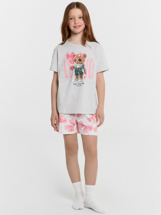 Пижама для девочек. Выполнена из трикотажной кулирки. Состоит из футболки и шортиков. Футболка свободная, с круглой горловиной, короткими рукавами. Шорты свободные, длиной до колен, пояс с эластичной тесьмой внутри. В такой пижамке сны будут действительно приятными!