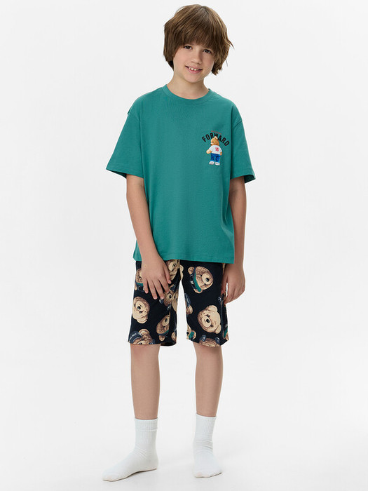 Этот домашний комплект для мальчиков — удобный и практичный выбор для отдыха и сна.  Футболка свободного силуэта обеспечивает комфортную посадку. Круглая горловина с обтачкой из рибаны добавляет мягкости и эластичности, обеспечивая удобство при носке. Свободные рукава и слегка спущенная линия плеча создают расслабленный силуэт, а обработка низа рукавов и футболки швом в подгибку делает изделие аккуратным и долговечным. Шорты ниже колена свободного силуэта и с высокой посадкой на талии обеспечивают максимальное удобство, создавая ощущение свободы движений. Эластичный пояс мягко фиксирует изделие, а обработка низа шорт швом в подгибку делает модель надежной и устойчивой к износу. Этот комплект из натурального хлопка идеально подходит для домашних образов, сочетая комфорт, практичность и стиль!