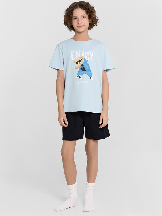 Пижама для мальчиков - это отличный комплект для сна и отдыха. Футболка имеет круглую горловину и короткие рукава, обеспечивающие комфорт и свободу движений. Шорты длиной до колен оснащены эластичной тесьмой в поясе для надежной посадки. Модель выполнена из хлопковой кулирки - натурального материала, который обладает отличной воздухопроницаемостью и мягкостью. Благодаря этим свойствам, такая пижама идеально подходит для сна и отдыха, создавая уют и комфорт в любое время года.