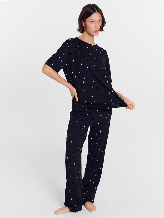 Комплект женский состоит из футболки и брюк. Футболка свободного силуэта. Горловина овальная с обтачкой из основного полотна. Нижний срез футболки и рукавов обработан швом вподгибку.