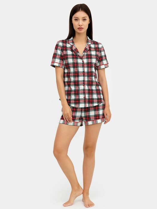 Комфортная пижама женская в "костюмном стиле" из высококачественного хлопка для приятных снов и домашних дел. Рубашка прямая, с отложным воротником и лацканами, короткими рукавами, застегивается на пуговицы. Дополняют ее свободные шорты длины мини, с резиновой тесьмой в поясе и атласной тесьмой, которая завязывается на бантик. Особенность модели – контрастные канты на рукавах, воротнике и передней части рубашки. В пижаме абсолютно не жарко, комфортный материал не сковывает движений. Красивая и интересная модель на каждый день. В линейке много интересных расцветок, широкий размерный ряд, есть актуальные варианты для девушек с пышными формами plus-size. Купить пижаму женскую недорого можно у нас на сайте и в магазинах. Лучший выбор домашней одежды на каждый день от Mark Formelle. Рекомендуем!