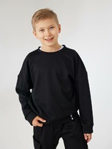 Джемпер свободного силуэта. Горловина круглой формы, обтачка горловины из рибаны. Плечо спущено, пройма углублена. Рукав втачной, длинный. По низу рукава отрезные манжеты из рибаны.