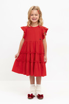 Воздушное нарядное платье для девочек. Выполнено из полупрозрачной сетки с хлопковой подкладкой на нижнем слое. Силуэт А-образный, с отрезными воланами. Вырез классический – круглый, не глубокий. Короткие рукава-фонарики с эластичной тесьмой. На спинке застегивается на пуговицу. Идеально для утренников и праздников!