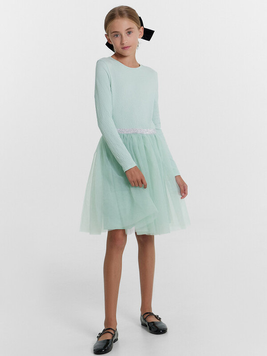 Платье полуприлегающего силуэта  с отрезной юбкой. Длина выше колена. Горловина круглая, окантована бейкой из основного полотна. Рукав втачной длинный. Низ рукава обработан на 2-х игольной плоскошовной машине. Юбка трехслойная на сборке. Верхние два слоя из трикотажного полотна сетки, подкладка из трикотажного кулирного полотна. Пояс из жаккардовой тесьмы
