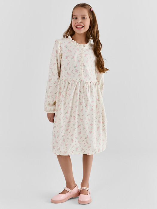 Платье прямого с отрезной юбкой по талии . По переду застежка - планка на 4 пуговицы. Горловина круглая обработана бейкой в чистый край, с рюшей. Рукав длинный втачной, с «крылышками» по пройме . По низу рукавов внутрь застрочена эластичная тесьма 10RV. Низ в подгибку.