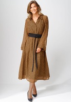 Текстильное платье мини женское полуприлегающего силуэта с фигурным низом. Перед с центральной застежкой на пуговицы. Горловина круглой формы с воротником-стойкой. Спереди и сзади заложены складки, подчеркивающие талию. Линия плеча спущена, длинные рукава заканчиваются широкими манжетами.