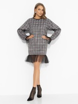 Платье полуприлегающего силуэта из ткани рошель. Горловина V-образной формы. Платье отрезное по талии, с эластичной тесьмой внутри. По эластичной тесьме проложены отделочные строчки. По детали переда средний шов. Детали спинки со средним швом. Рукав втачной, длинный. По окату слегка присборен. Длина рукава 3\4, по низу рукава настрочена эластичная тесьма которая делает сборку. Низ платья расширяется к низу. Длина платья ниже колена.