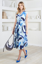Платье полуприлегающего силуэта из ткани рошель. Горловина V-образной формы. Платье отрезное по талии, с эластичной тесьмой внутри. По эластичной тесьме проложены отделочные строчки. По детали переда средний шов. Детали спинки со средним швом. Рукав втачной, длинный. По окату слегка присборен. Длина рукава  3\4, по низу рукава настрочена эластичная тесьма которая делает сборку. Низ платья расширяется к низу. Длина платья ниже колена.