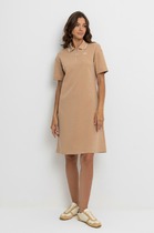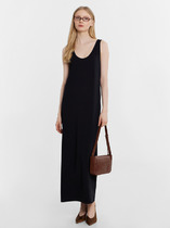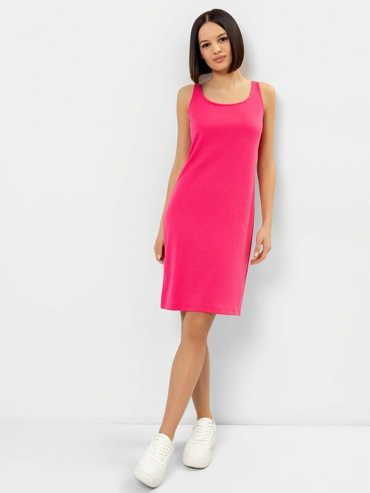 Платье из интерлока облегающего силуэта без рукавов.Глубокая горловина каре по переду и спинке. Горловина и проймы обработаны бейкой их кулирного полотна в цвет швом «в чистый край». Узкое плечо. Перед цельнокроенный. Спинка со средним швом, припуски которого расстрочены. В низу шва обработан разрез. Длина изделия по колено. Низ изделия обработан швом вподгибку на плоскошовной машине.