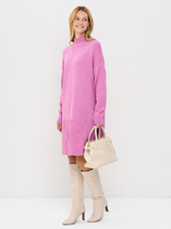 в чистый край. Горловина спинки более вырезана. Рукав втачной длинный, к низу рукав расширяется. Платье длиной выше колена.