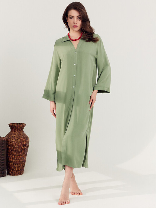 Платье женское домашнее прямого силуэта. Перед с центральной застежкой и отрезной планкой на пуговицах . Горловина V-образной формы, в горловину втачан воротник отложной. Рукав 7/8 укорочен, втачной. По низу рукава отрезная манжета. Нижний срез платья обработан швом вподгибку. Платье длиной ниже колена, в боковых швах обработаны разрезы.