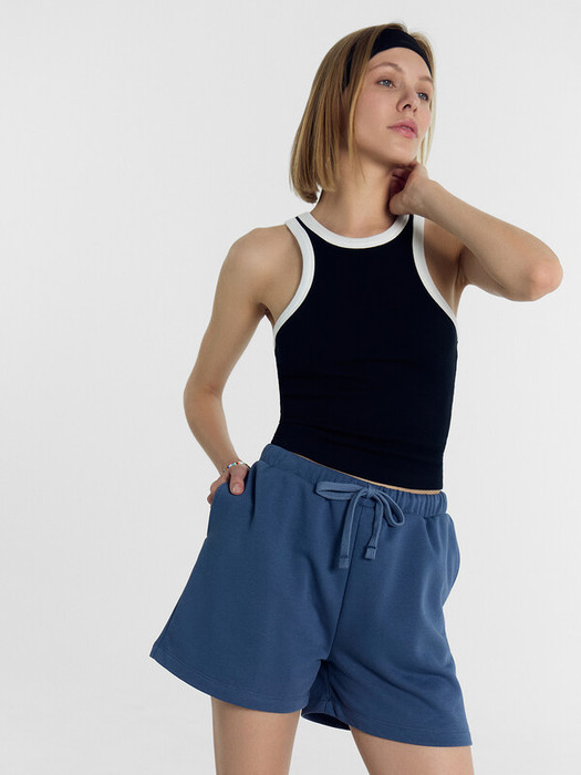 Мини-шорты свободного силуэта из легкого трикотажного футера. Высокая посадка на талии, эластичная тесьма в поясе, регулировочный шнурок-завязка и удобные боковые карманы – комфортный минимализм!