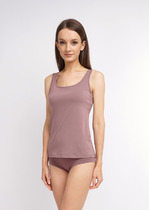 Горловина округлой формы, бретели тонкие. Срезы горловины и проймы окантованы бейками из основного полотна.
