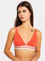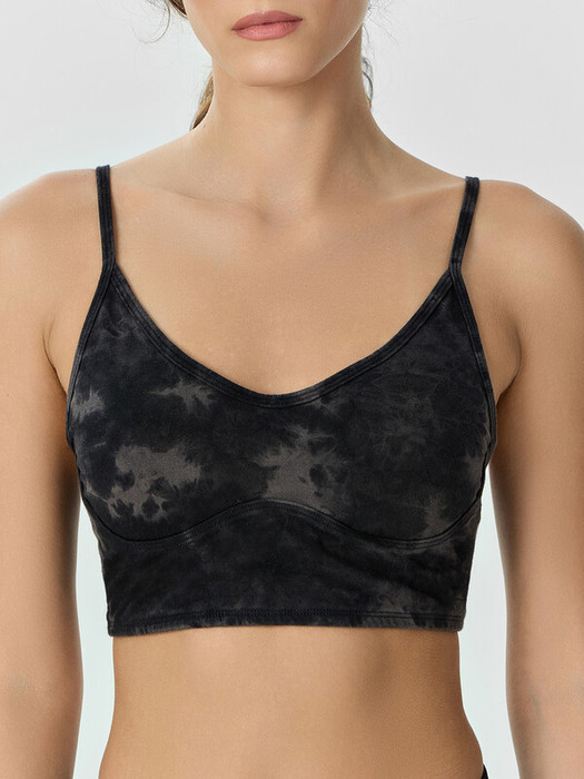 Топ облегающего силуэта, на узких бретелях. Горловина V-образной формы. Топ на подкладке из сетки, с чашками-вкладышами. Горловина и проймы окантованы бейкой из основного полотна. Бейки по проймам переходят в бретель, с регулировкой по длине (кольца и регуляторы). Топ с фигурным подрезом под грудью. В бретелях, окантовке горловин и пройм, по фигурному подрезу, эластичная тесьма. Нижний срез обработан швом вподгибку с эластичной тесьмой внутри